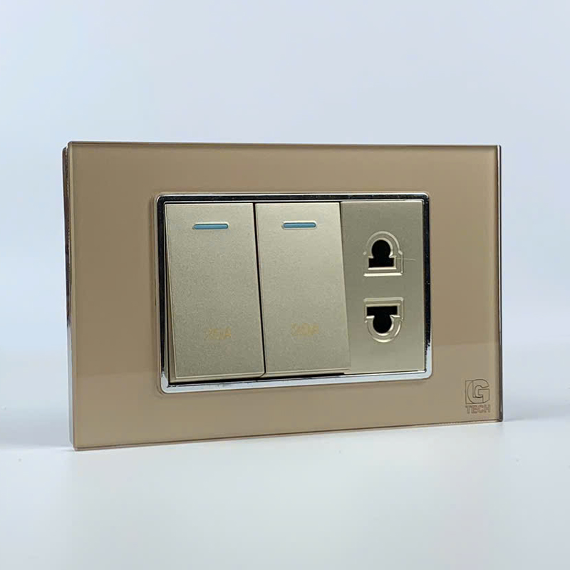 Mô đun 2 công tắc 20A và 1 ổ cắm 2 chấu, size 24mm viền kính màu gold LG Tech – tiện ích điều khiển và cấp nguồn trong cùng một thiết bị