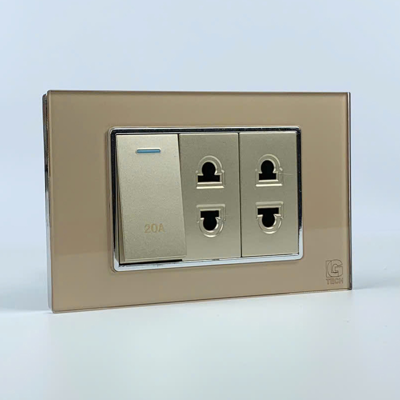 Mô đun công tắc 20A và 2 ổ cắm 2 chấu, size 24mm viền kính màu gold LG Tech – điều khiển và cấp nguồn tiện lợi trong cùng một thiết bị