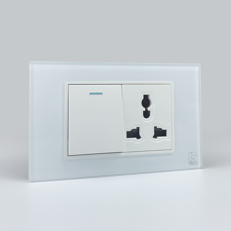 Mô đun công tắc đơn 1 chiều và ổ cắm 3 chấu, size 36mm viền kính màu trắng LG Tech – Tiện ích kép, thẩm mỹ đồng bộ
