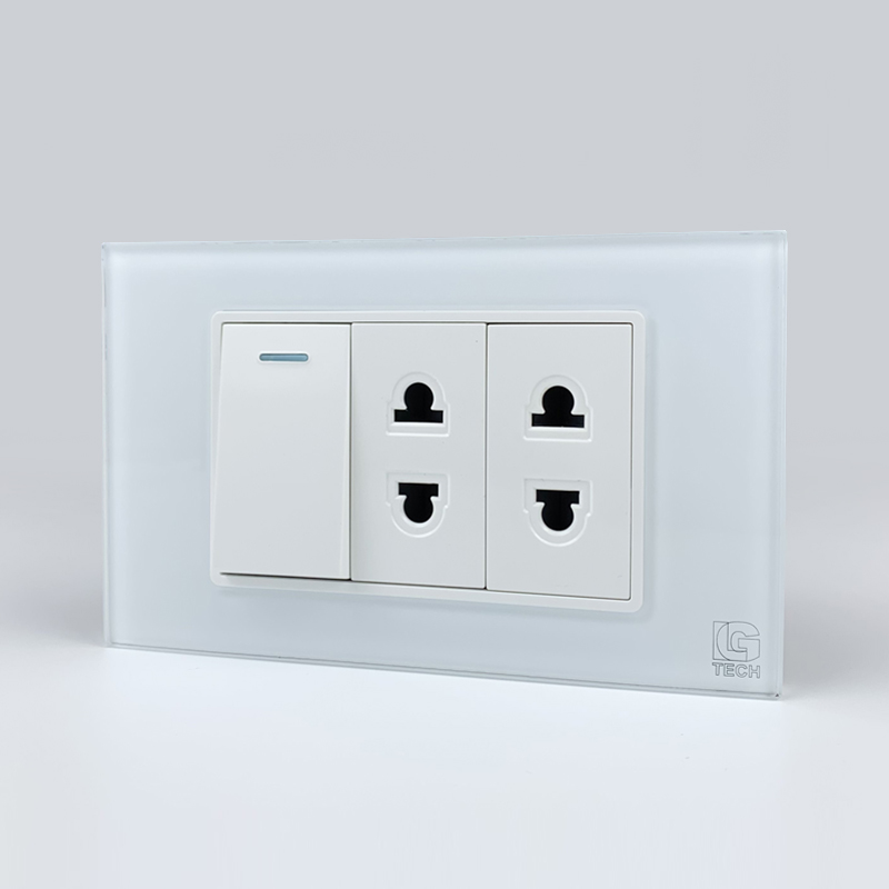 Mô đun công tắc đơn 1 chiều và 2 ổ cắm 2 chấu, viền kính màu trắng LG Tech – Tối ưu công năng, nâng tầm thẩm mỹ