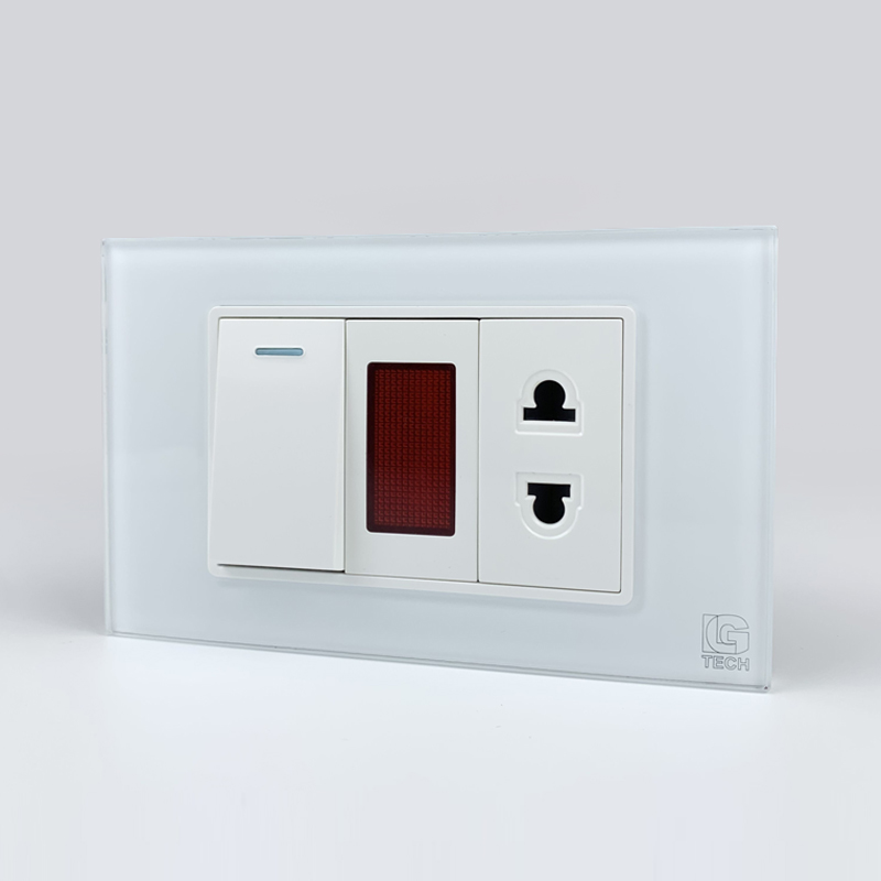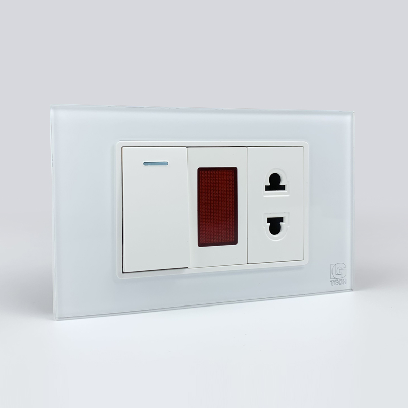 Mô đun công tắc đơn 1 chiều và ổ cắm 2 chấu có đèn báo, viền kính màu trắng LG Tech – An toàn, tiện lợi, sang trọng