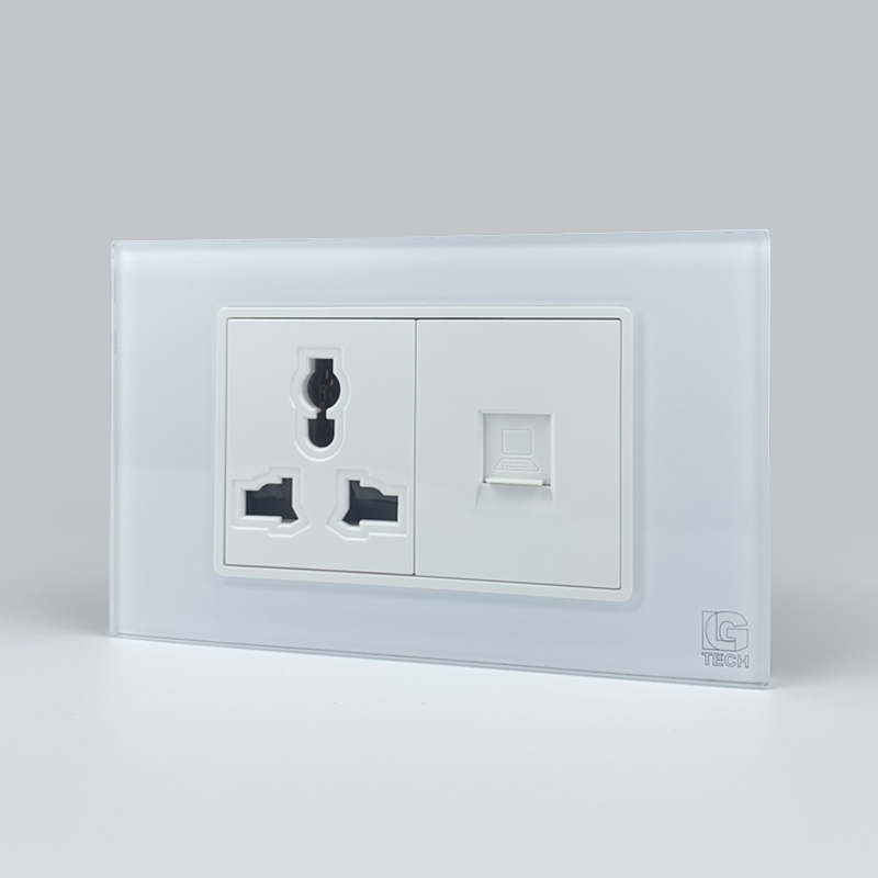 Mô đun ổ cắm 3 chấu và ổ cắm mạng LAN CAT5, size 36mm viền kính màu trắng LG Tech – Tối ưu kết nối, đảm bảo an toàn