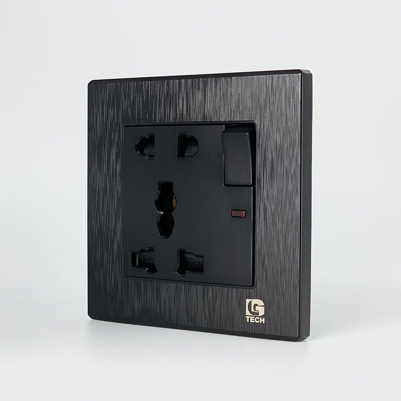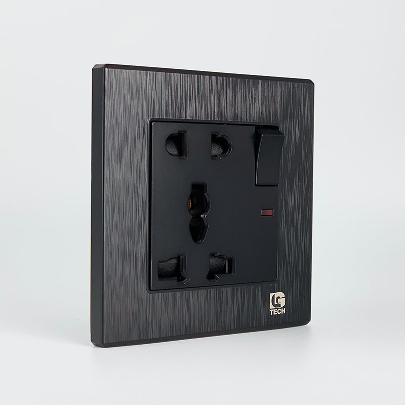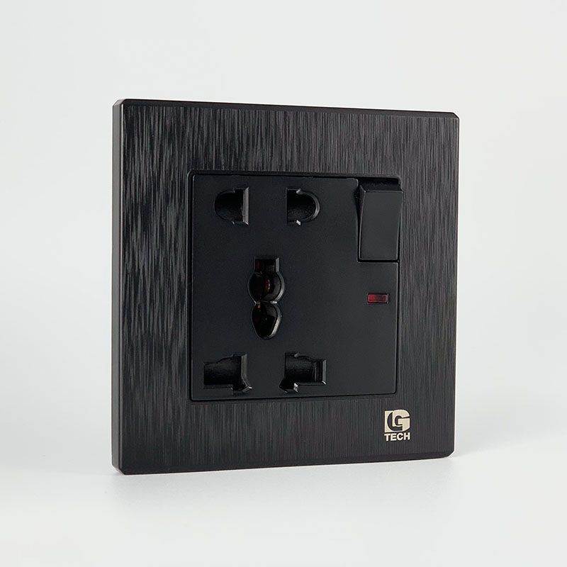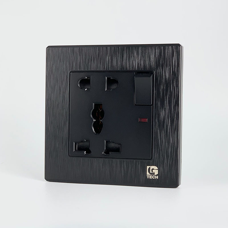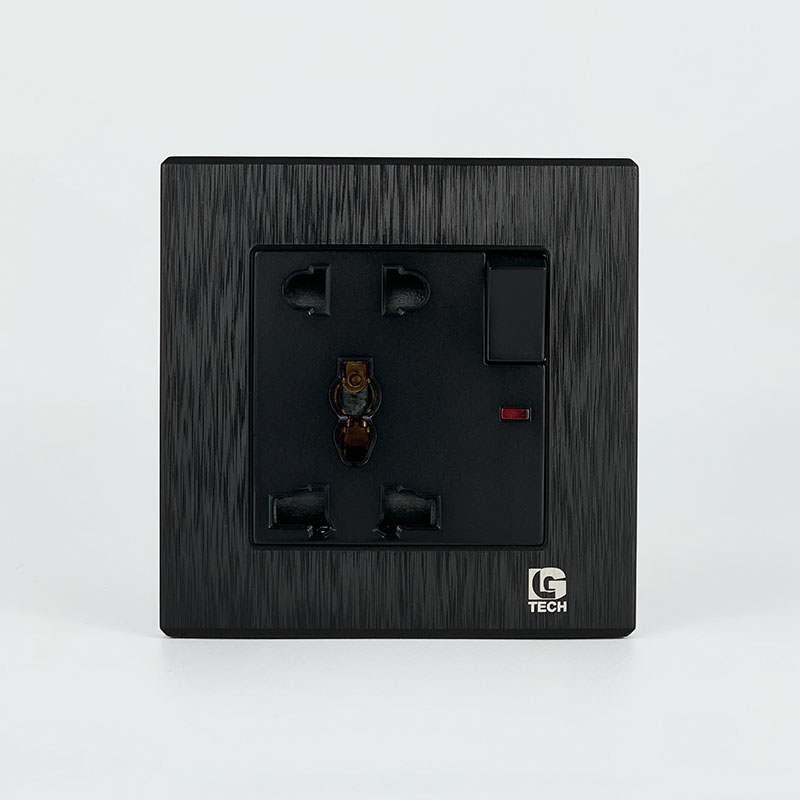 Ổ cắm 5 chấu có công tắc và đèn báo màu đen xước LG Tech – An toàn chủ động, sử dụng tiện lợi
